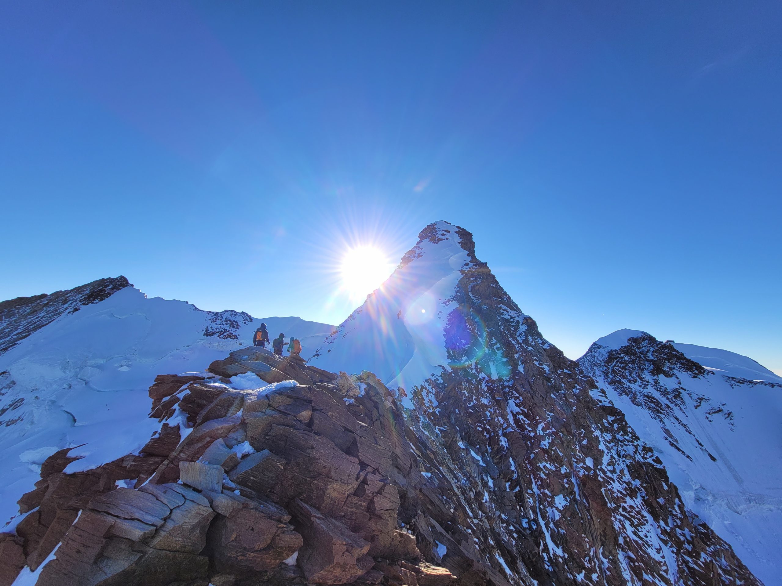 Noch vor der Morgendämmerung starten wir von der Monte Rosa Hütte hinauf auf den Monte-Rosa Gletscher. Diesem folgen wir zum Grat und erreichen nach langer, teilweise exponierter Gratkletterei den 4634m hohen Gipfel. Entlang unserer Aufstiegsroute steigen wir wieder ab, vorbei an der Monte Rosa Hütte bis zur Gornergratbahn.
