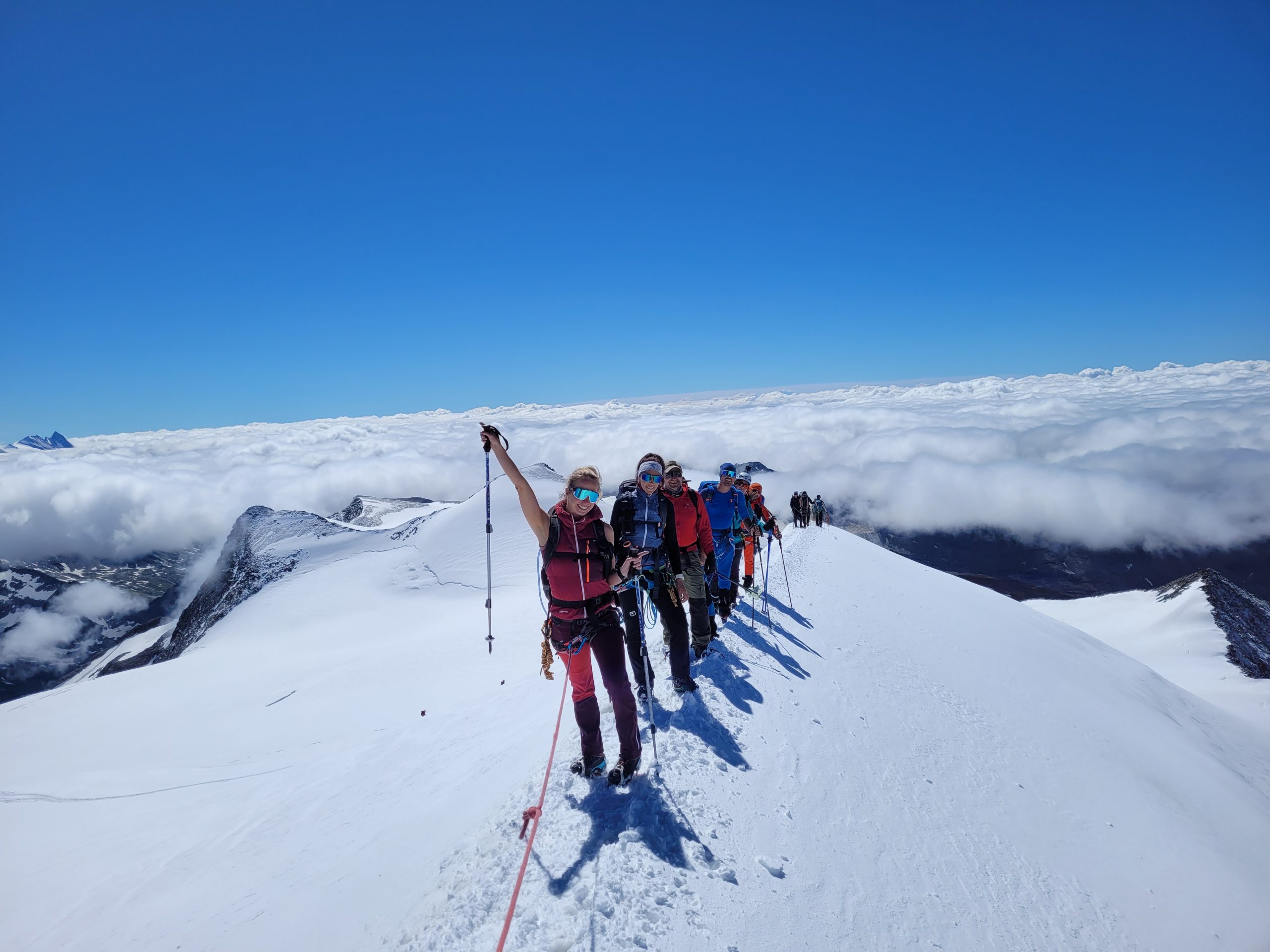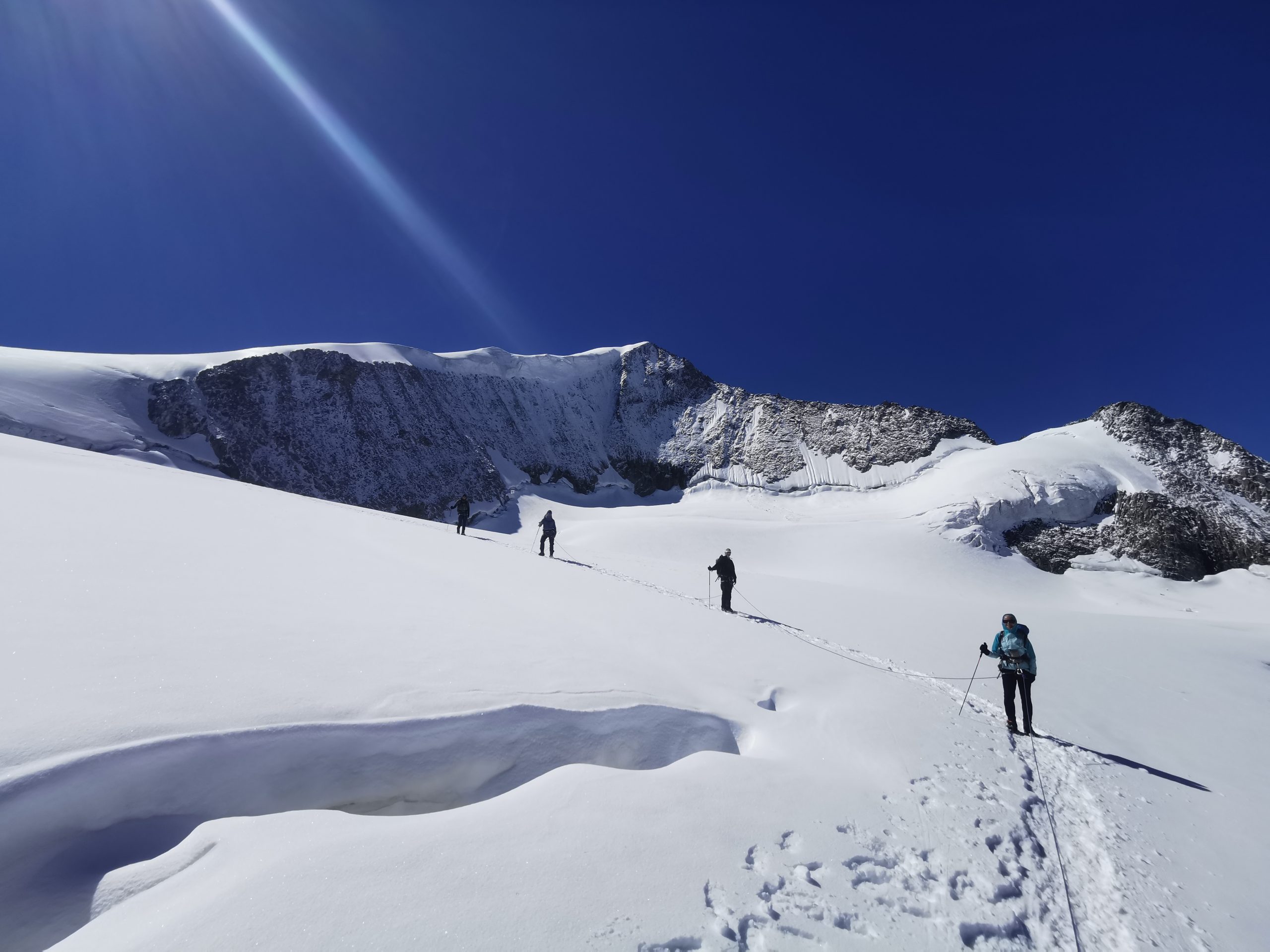 Man folgt dem markierten Steig über dem Kessel des Obersulzbachkees bis an den Beginn des Gletschers (ca. 1std.). Nach einer kurzen Pause geht es Angeseilt über den mächtigen Gletscher bis auf eine Höhe von ca. 3000m, wo wir nun zum Einstieg des Nordgrates queren.