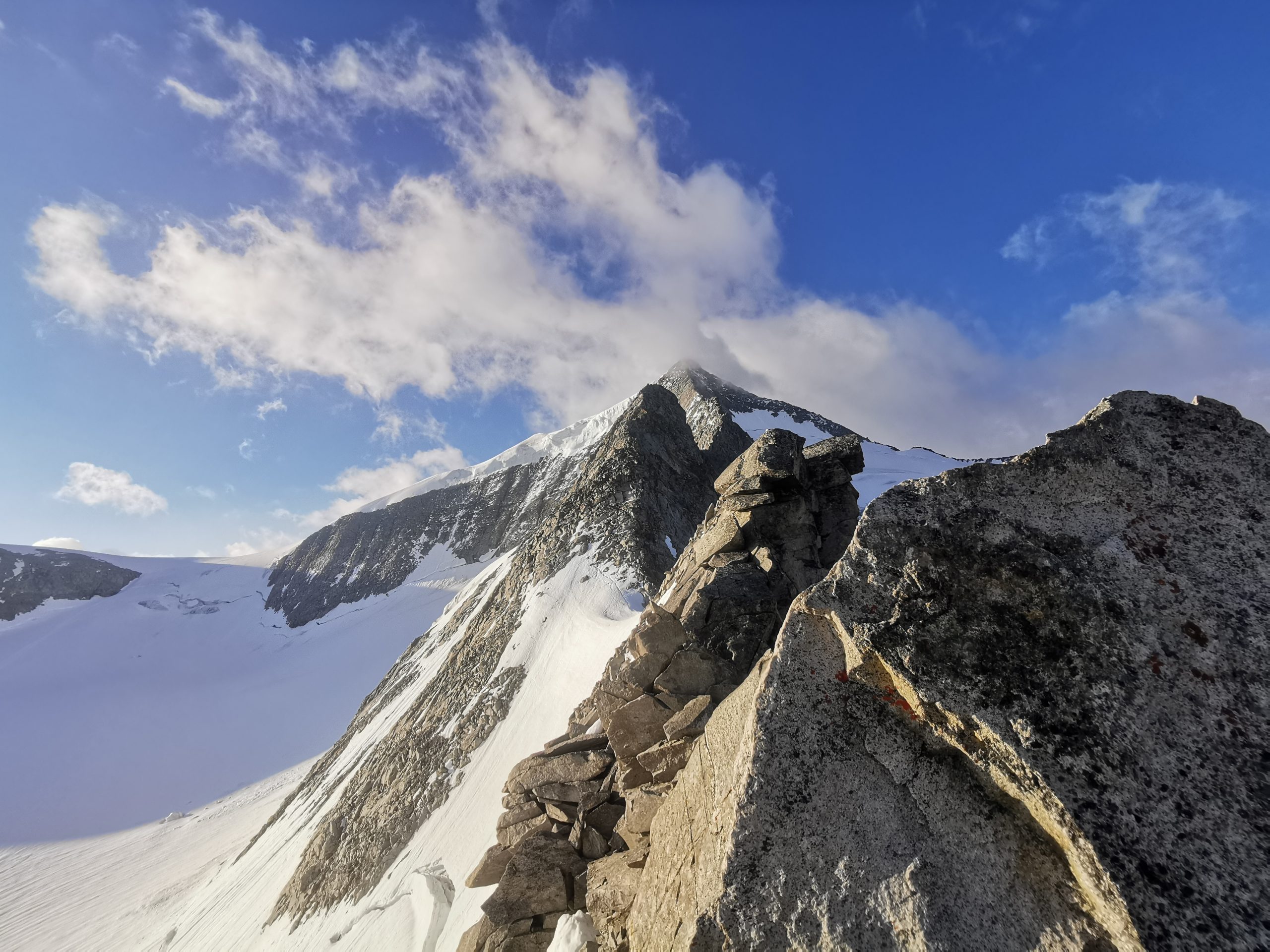 Ab hier ist der Grat schmal und ausgesetzt aber doch noch als Blockgrat leicht zu klettern. Über Festes Blockwerk leitet der Grat zielstrebig direkt hinauf unter den großen Gipfel des Venedigers. Die nun folgenden ca. 15m hohe „böse Platte“ ist die Schlüsselstelle der rassigen Grattour in mitten der Hohen Tauern. Anschließend besteht der Grat nur mehr aus Blöcken und die Schwierigkeiten nehmen dadurch wieder ab. Schließlich verliert sich der Grat unter dem Firn der Gipfelhaube des Großvenedigers.