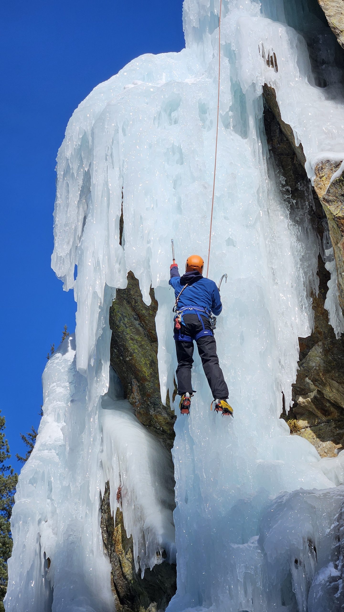 Ziel des Tages ist es, im Top-Rope-Modus möglichst viele Klettermeter zu sammeln, Sicherheit im Umgang mit der Ausrüstung zu gewinnen und Vertrauen in das Eis zu entwickeln – Spaß und erste Erfolgserlebnisse inklusive!