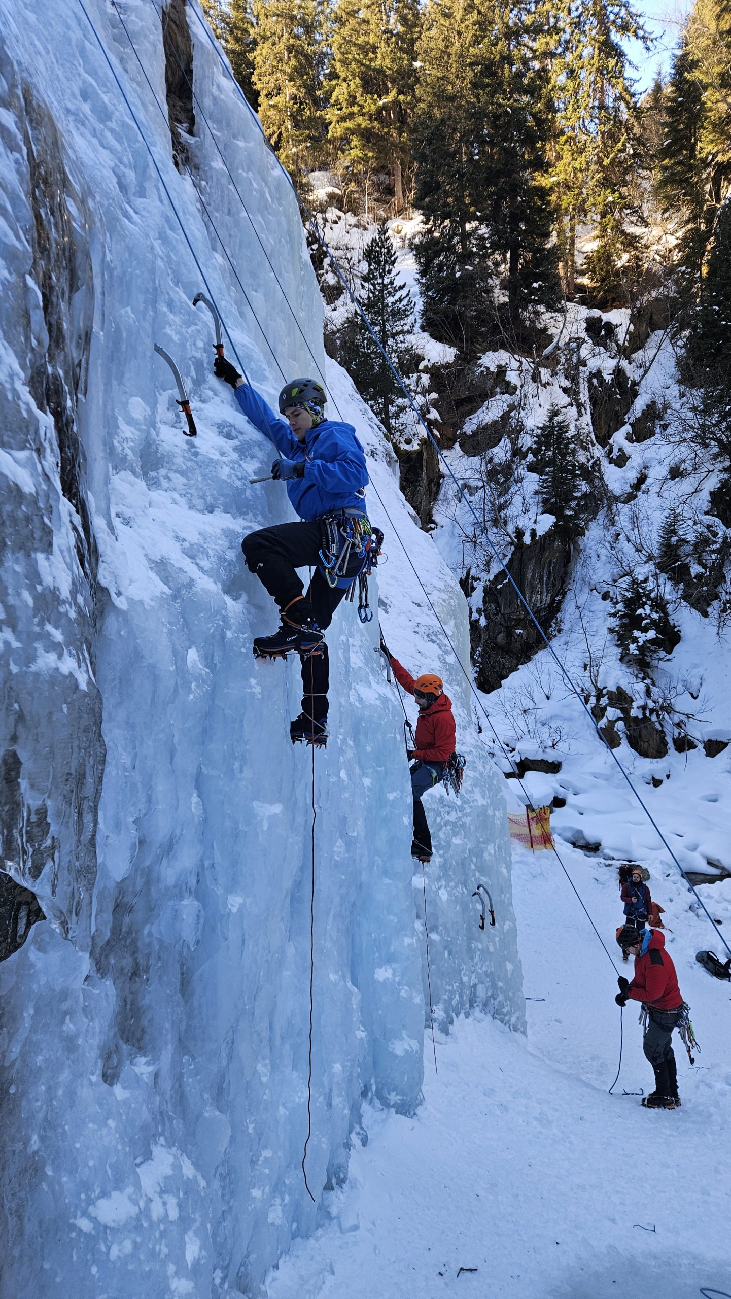 Am zweiten Tag starten wir damit, das am Vortag Gelernte zu wiederholen und zu festigen. Danach steigen wir in die nächste Stufe des Eiskletterns ein: das Vorstiegsklettern.