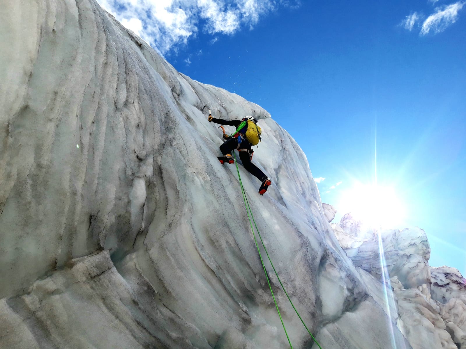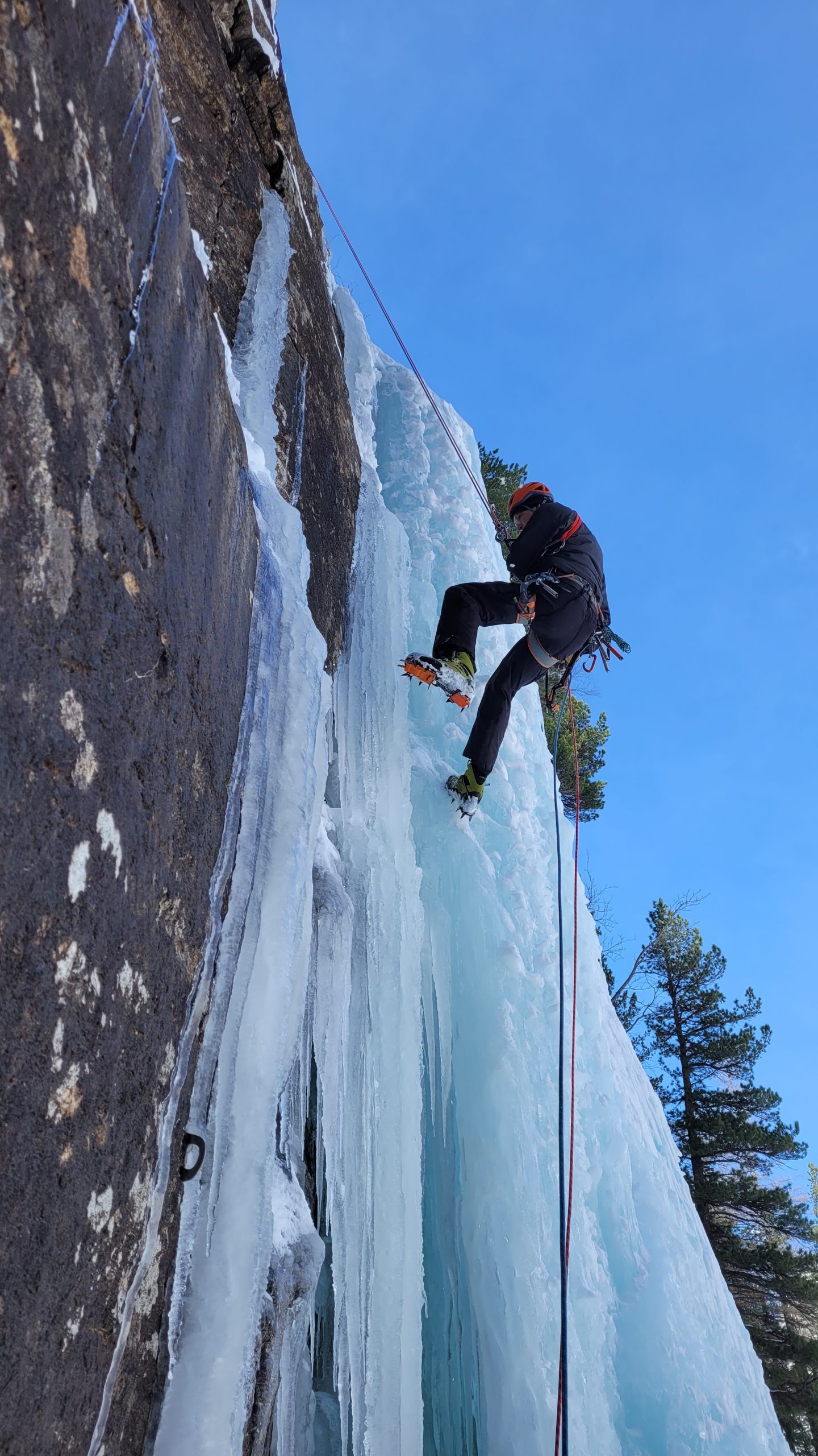 Am zweiten Tag starten wir damit, das am Vortag Gelernte zu wiederholen und zu festigen. Danach steigen wir in die nächste Stufe des Eiskletterns ein: das Vorstiegsklettern.
