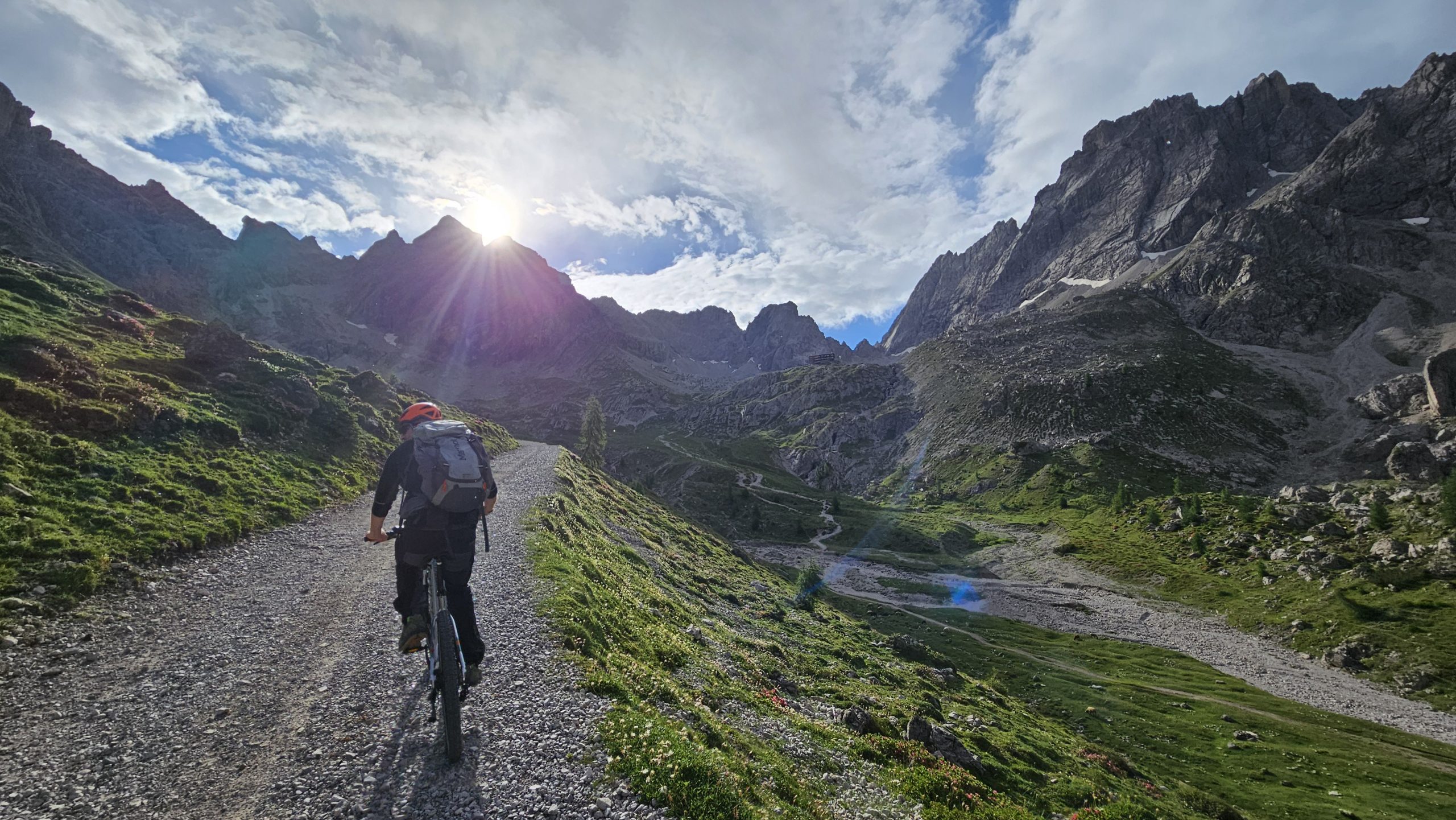 Treffpunkt ist um 15:00 Uhr am Parkplatz der Dolomitenhütte. Anschließend führen wir einen Materialcheck durch, bevor wir den etwa zweistündigen Zustieg zur Karlsbader Hütte beginnen. Wer den Aufstieg abkürzen möchte, hat die Möglichkeit, mit dem E-Bike hinaufzufahren. Nach dem Abendessen besprechen wir gemeinsam die Tourenplanung für den nächsten Tag.
