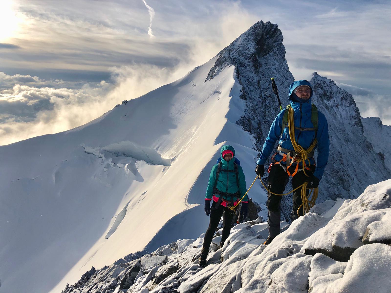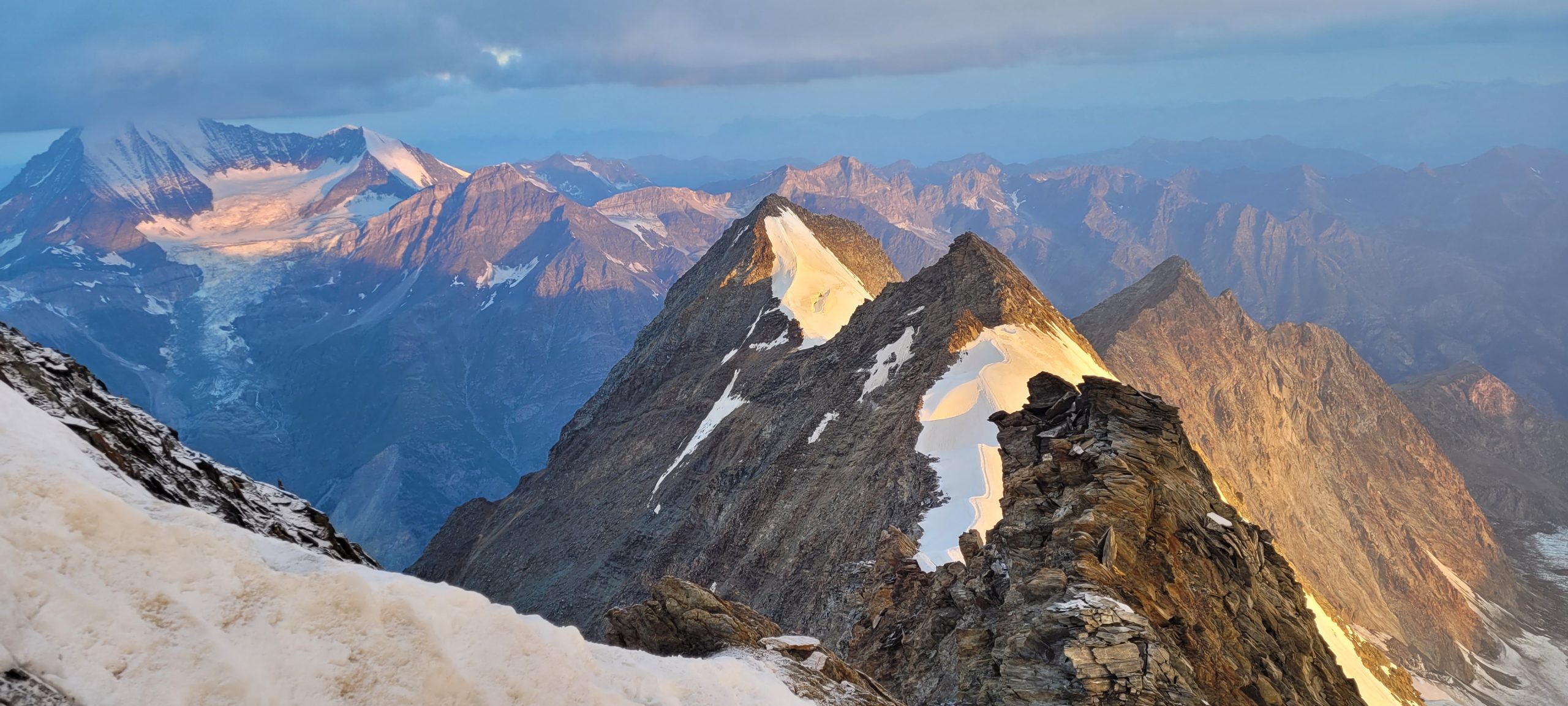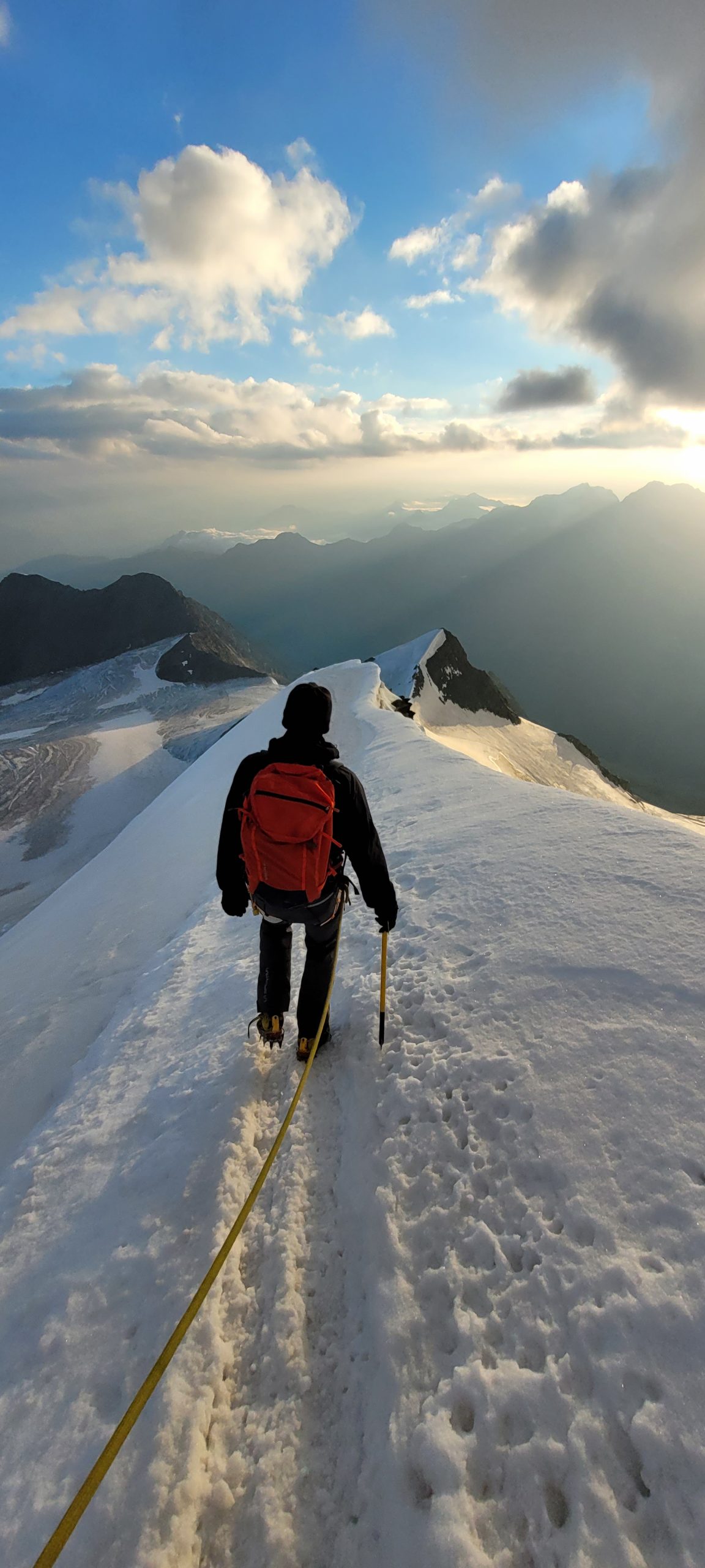 Nach einem reichhaltigen Frühstück starten wir noch im Morgengrauen Richtung Hohbalmgletscher. Nach einem steilen Gletscheraufschwung erreicht man das Windjoch 3850m. Nach einem beeindruckenden Sonnenaufgang über dem Weissmies geht’s weiter über ein Fingrat bis kurz unterhalb des Gipfels. Dort angekommen trennen uns nur noch ein paar leichte klettermeter vom Gipfel des Nadelhorns 4327m.