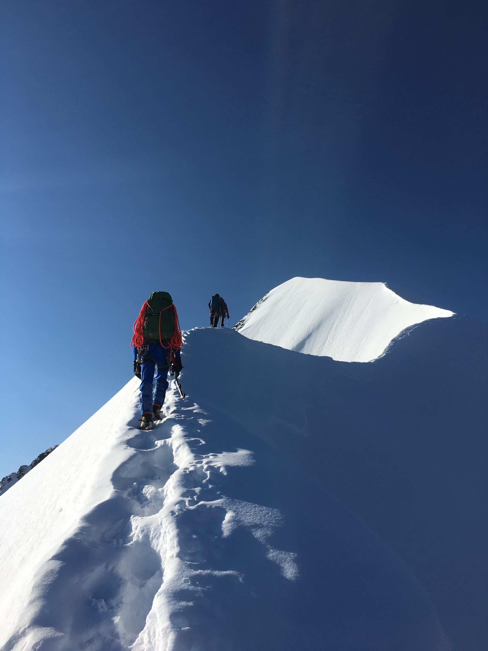 Am zweiten Tag heißt es sehr früh starten. Nach den ersten Felspassagen stehen wir zum Sonnenaufgang in der Fuorcla Prievlusa, dort beginnt dann unser Abenteuer „Himmelsleiter“ Biancograt. Wir steigen über den markanten Firngrat und leichter Kletterei (UIAA 3.) zum höchsten Ostaplen Gipfel dem Piz Bernina 4049m auf.